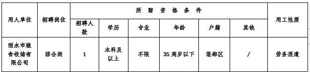 因工作需要,丽水市粮食收储有限公司招聘派遣制工作人员1名,现将有关事项公告如下: