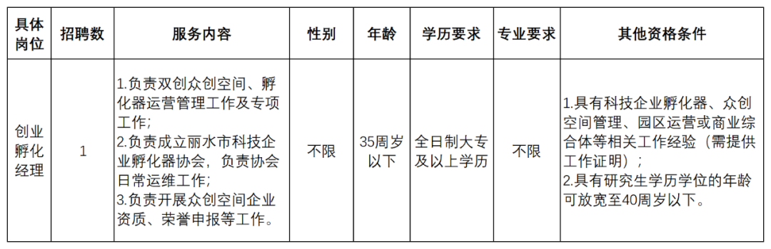 因业务需要,丽水市智汇人力资源服务中心有限公司承揽浙江丽数产业运营有限公司双创众创空间项目运营配套服务,现面向社会招聘创业孵化经理1名(外包人员),具体公告如下: