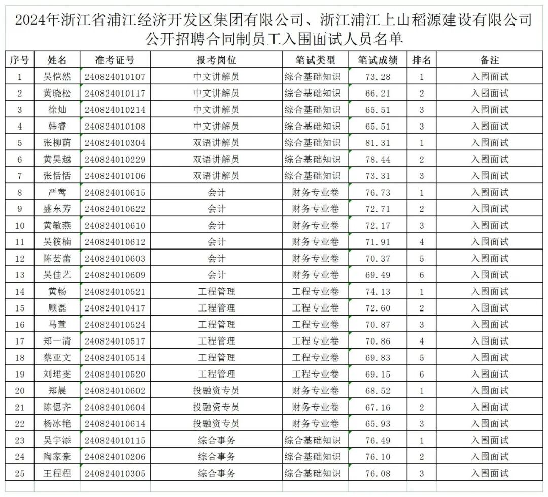 2. 2024年浙江省浦江经济开发区集团有限公司、浙江浦江上山稻源建设有限公司公开招聘合同制员工入围面试人员名单