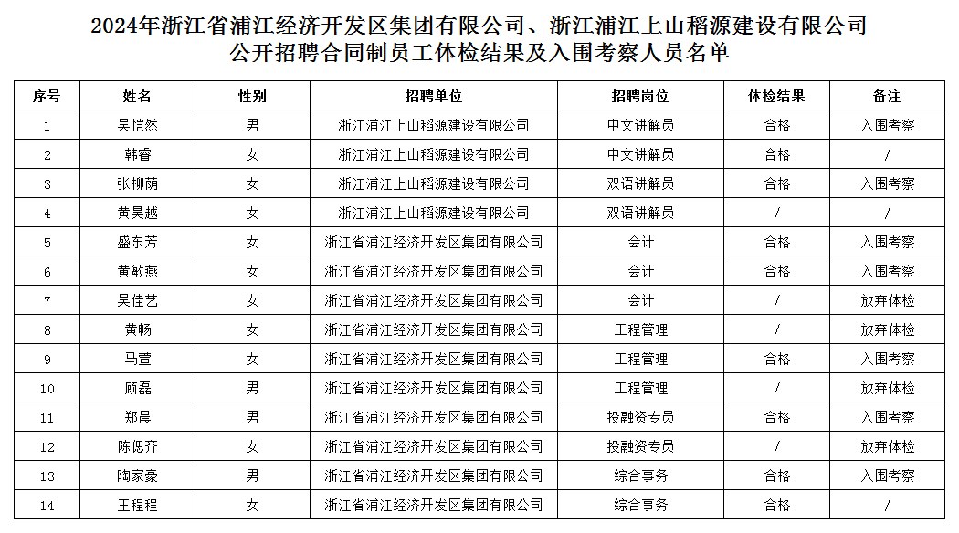 附件:2024年浙江省浦江经济开发区集团有限公司、浙江浦江上山稻源建设有限公司公开招聘合同制员工体检结果及入围考察人员名单