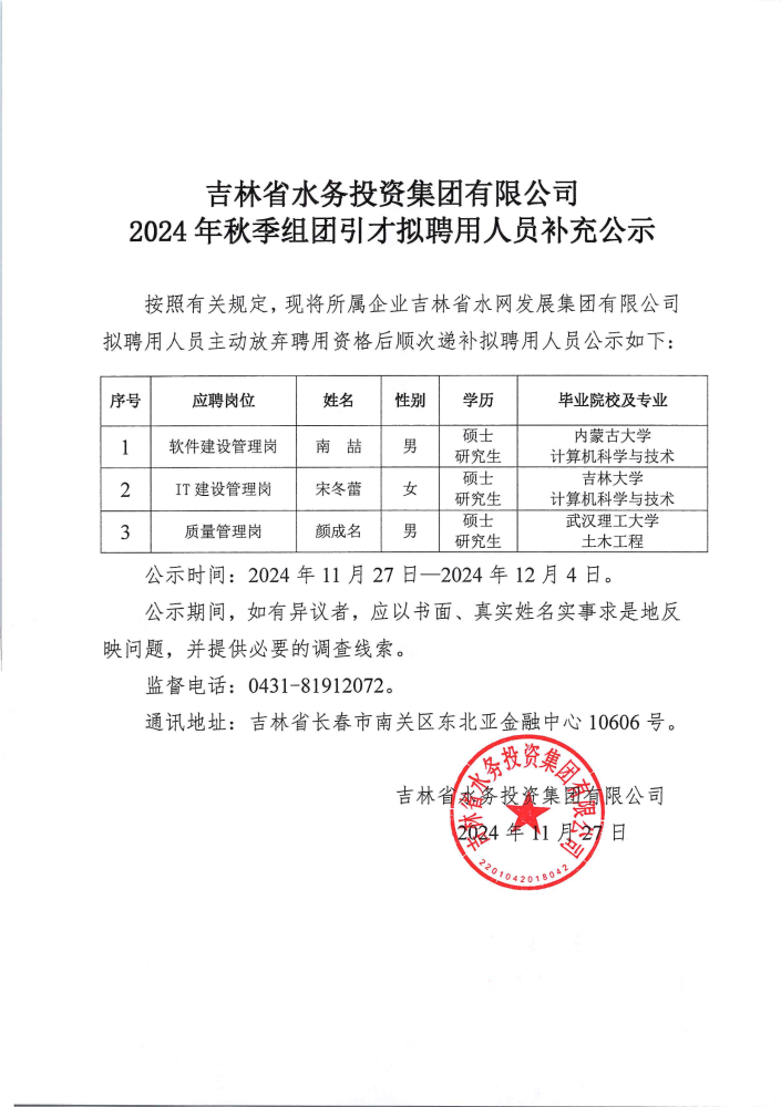 吉林省水务投资集团有限公司2024年秋季组团引才拟聘用人员补充公示