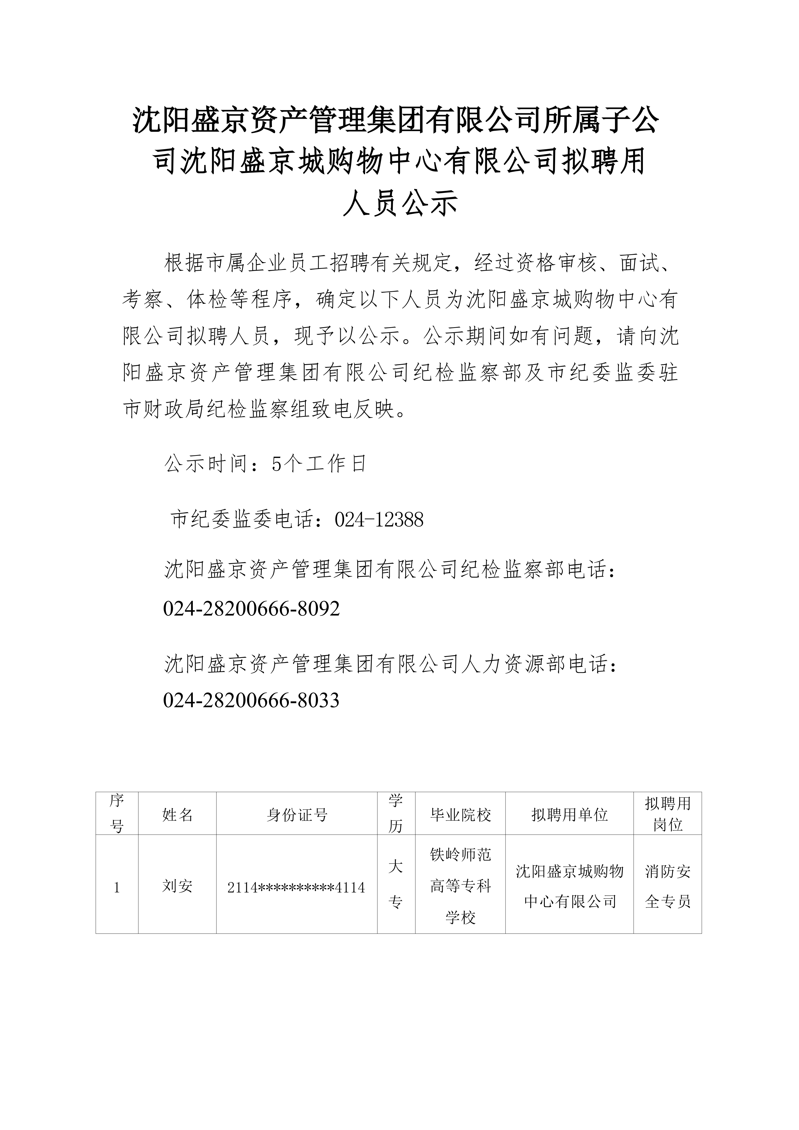 沈阳盛京资产管理集团有限公司所属子公司沈阳盛京城购物中心有限公司拟聘用人员公示