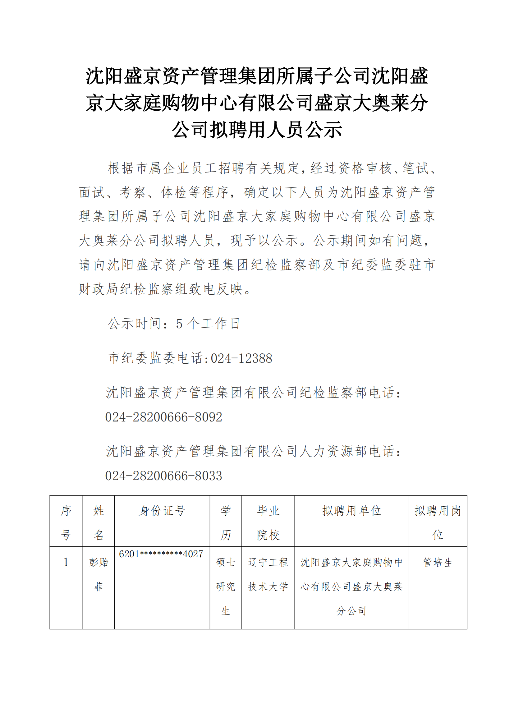 沈阳盛京资产管理集团所属子公司沈阳盛京大家庭购物中心有限公司盛京大奥莱分公司拟聘用人员公示