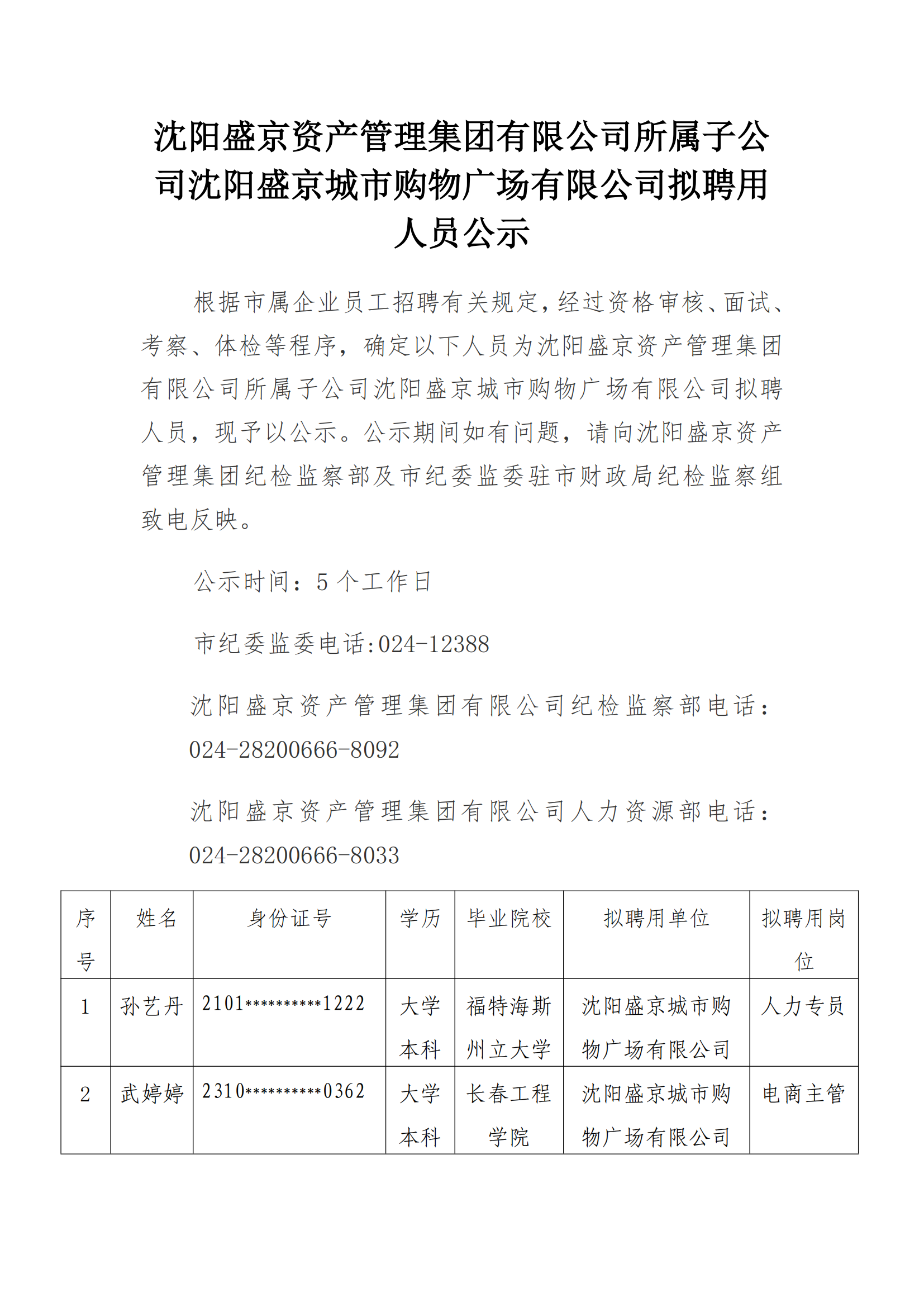 沈阳盛京资产管理集团有限公司所属子公司沈阳盛京城市购物广场有限公司拟聘用人员公示