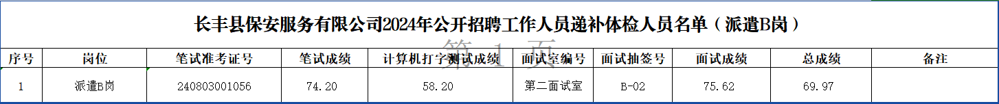 由于有考生离职,根据《长丰县保安服务有限公司2024年公开招聘工作人员公告》(2024-7-16)的规定,1名考生(详见附表)入围递补体检环节。请考生携带有效身份证件,一张二寸彩照(无底色要求),于2024年12月9日上午7:30前到合肥市兴海苑小学(合肥市瑶海区萧城路5号东南门)集合,参加体检。不能按时参加的,视为自动放弃。