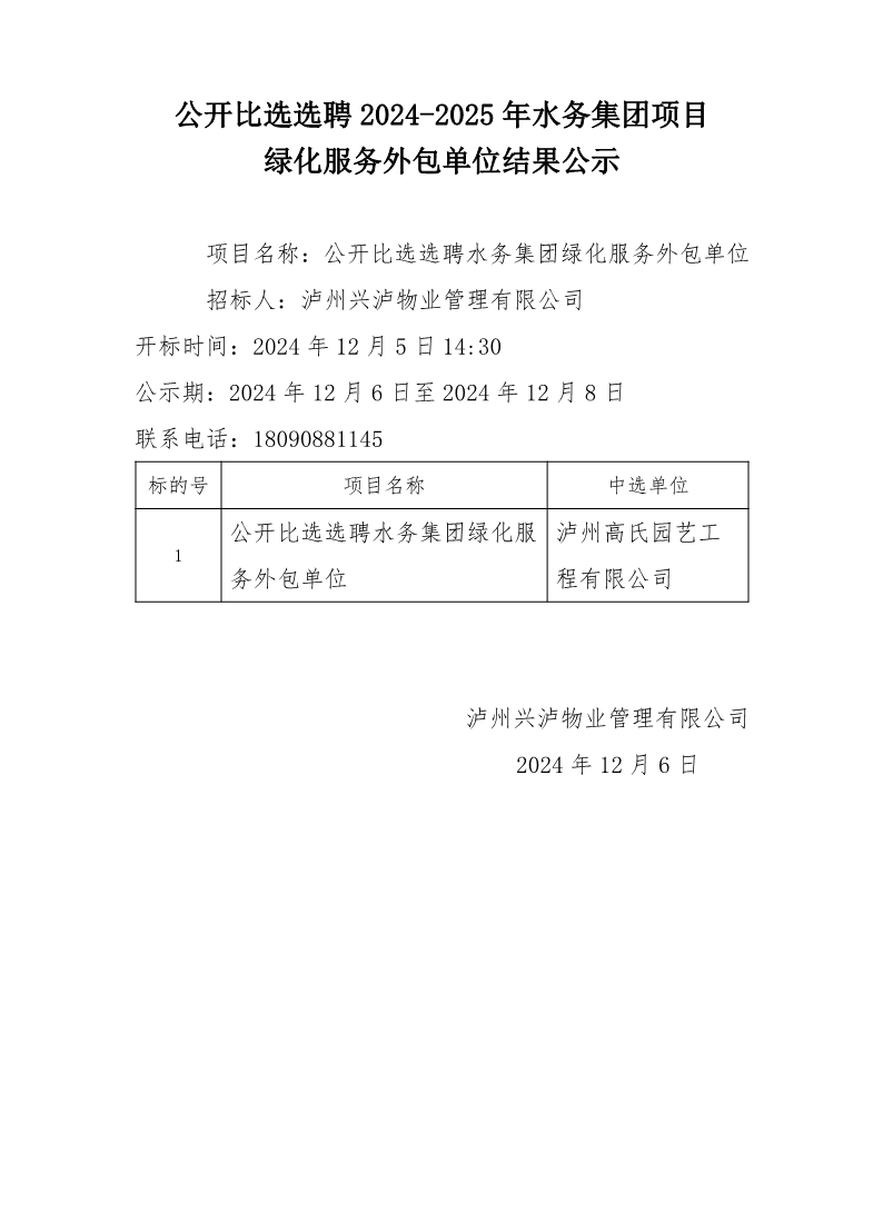 2024-12-06公开比选选聘2024-2025年水务集团项目绿化服务外包单位结果公示