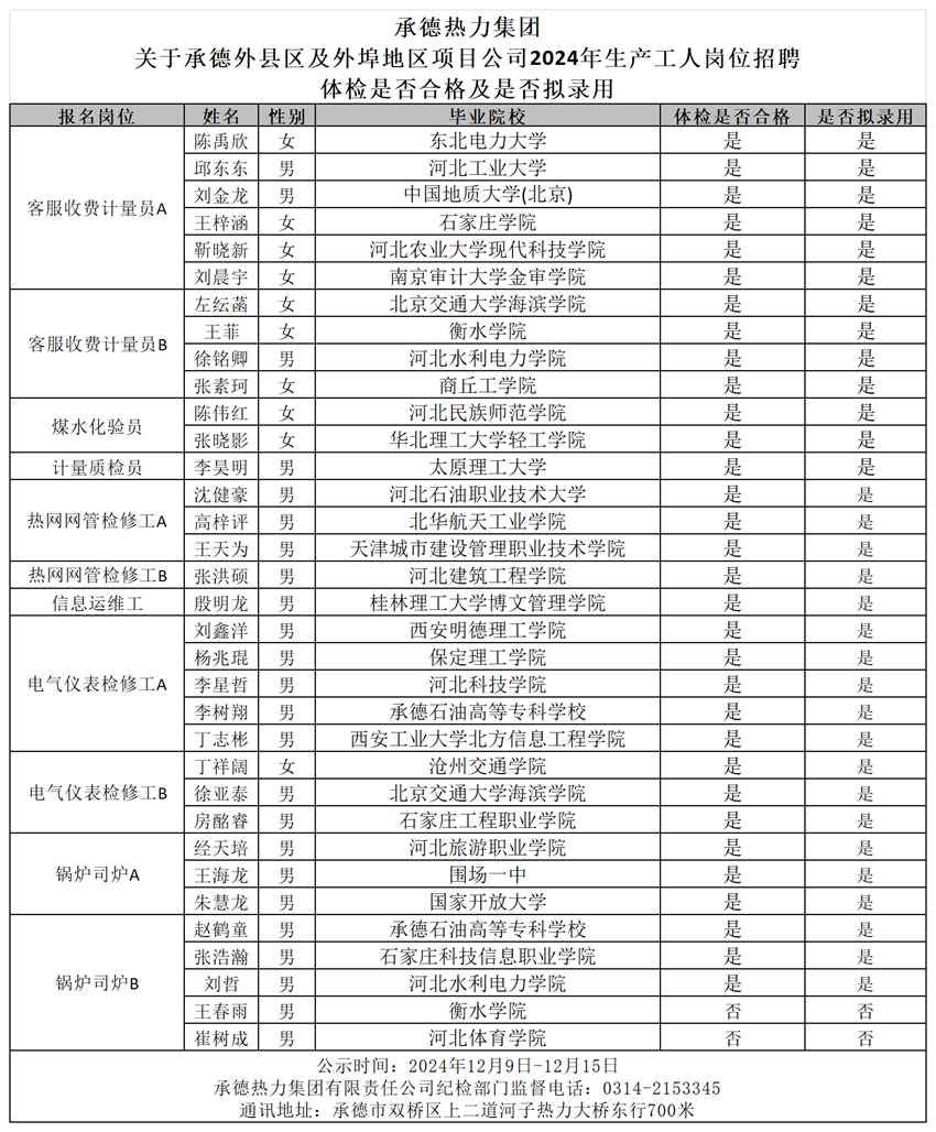 关于承德外县区及外埠地区项目公司2024年生产工人岗位招聘体检是否合格及是否拟录用