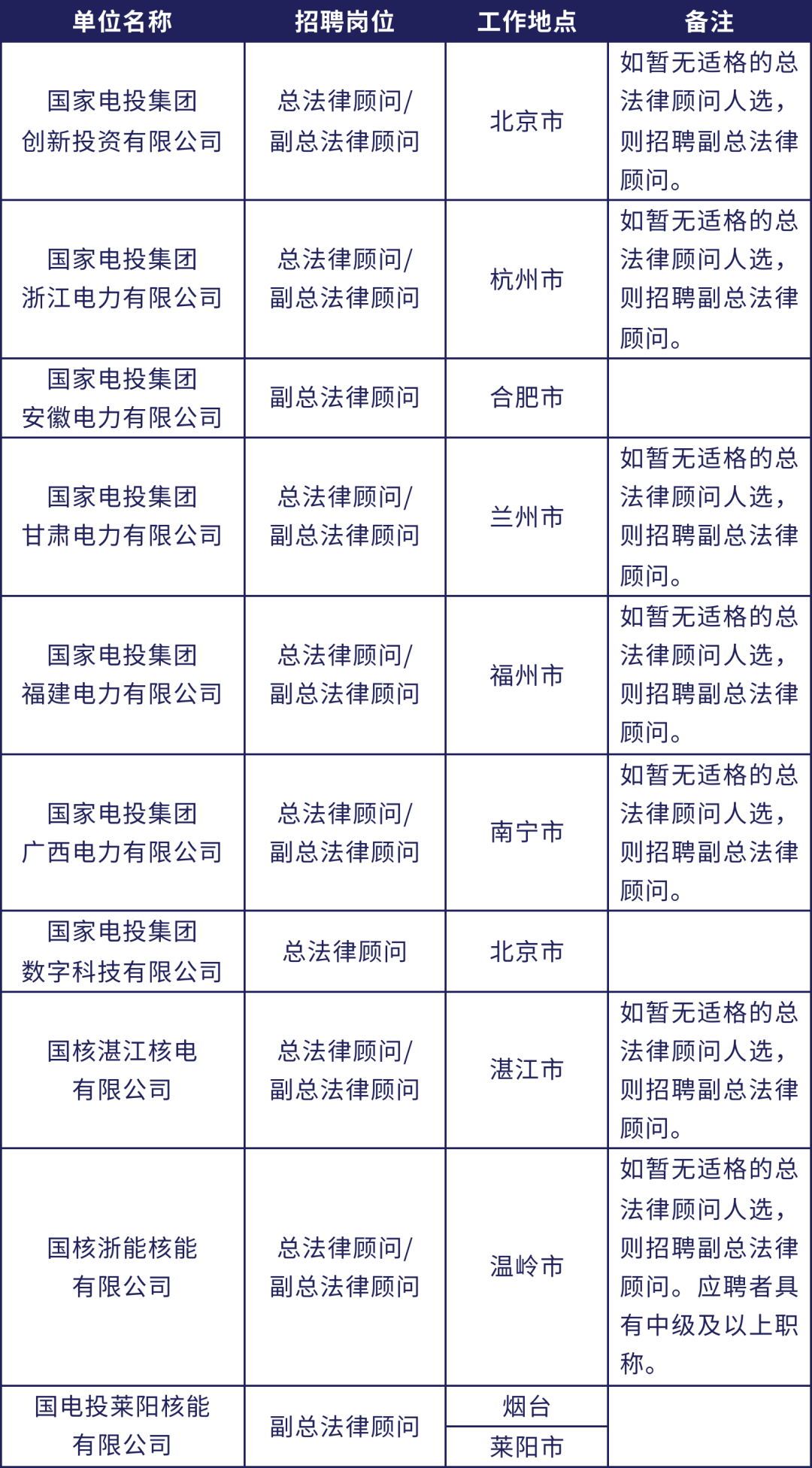 根据工作需要,国家电投所属部分二级单位面向系统内外公开招聘总法律顾问或副总法律顾问(副总法律顾问只面向系统内招聘)。现将具体事项公告如下。