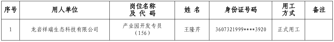 根据8月15日发布的《2024年龙岩人才活动周市属国企优质岗位引进人才招聘公告》及2024年9月7日发布的《2024年龙岩人才活动周市属国企优质岗位引进人才招聘公告部分岗位延期报名的补充公告》有关要求,经报名、资格审查、组织考试、体检、考察等程序,现将龙岩祥瑞生态科技有限公司产业园开发专员(岗位代码156)岗位拟录用人员名单公示如下: