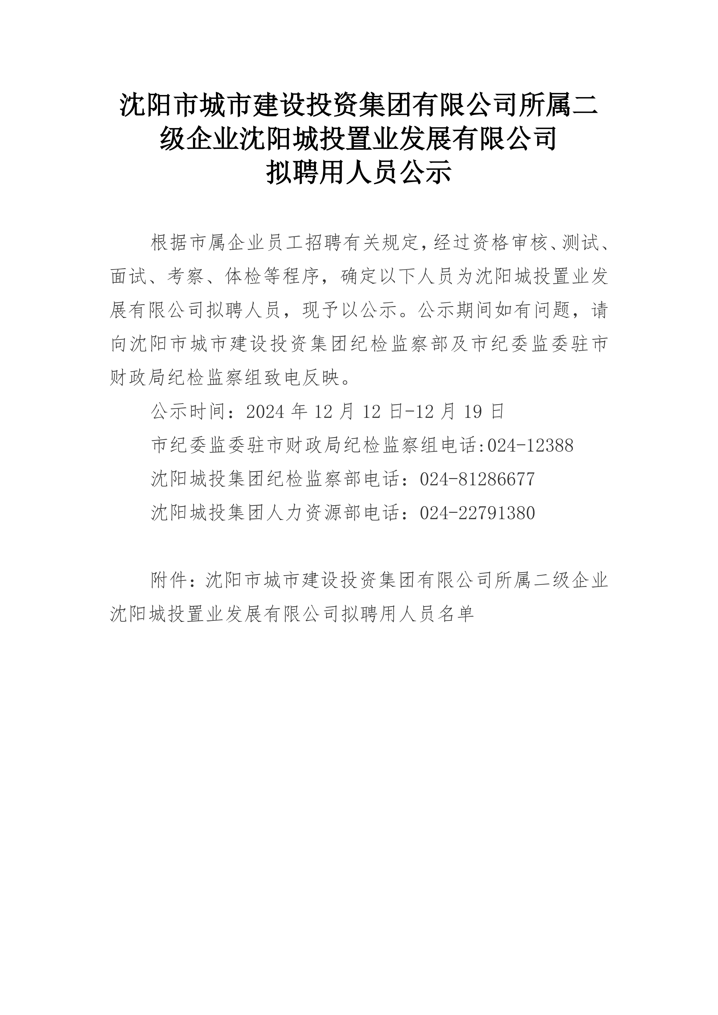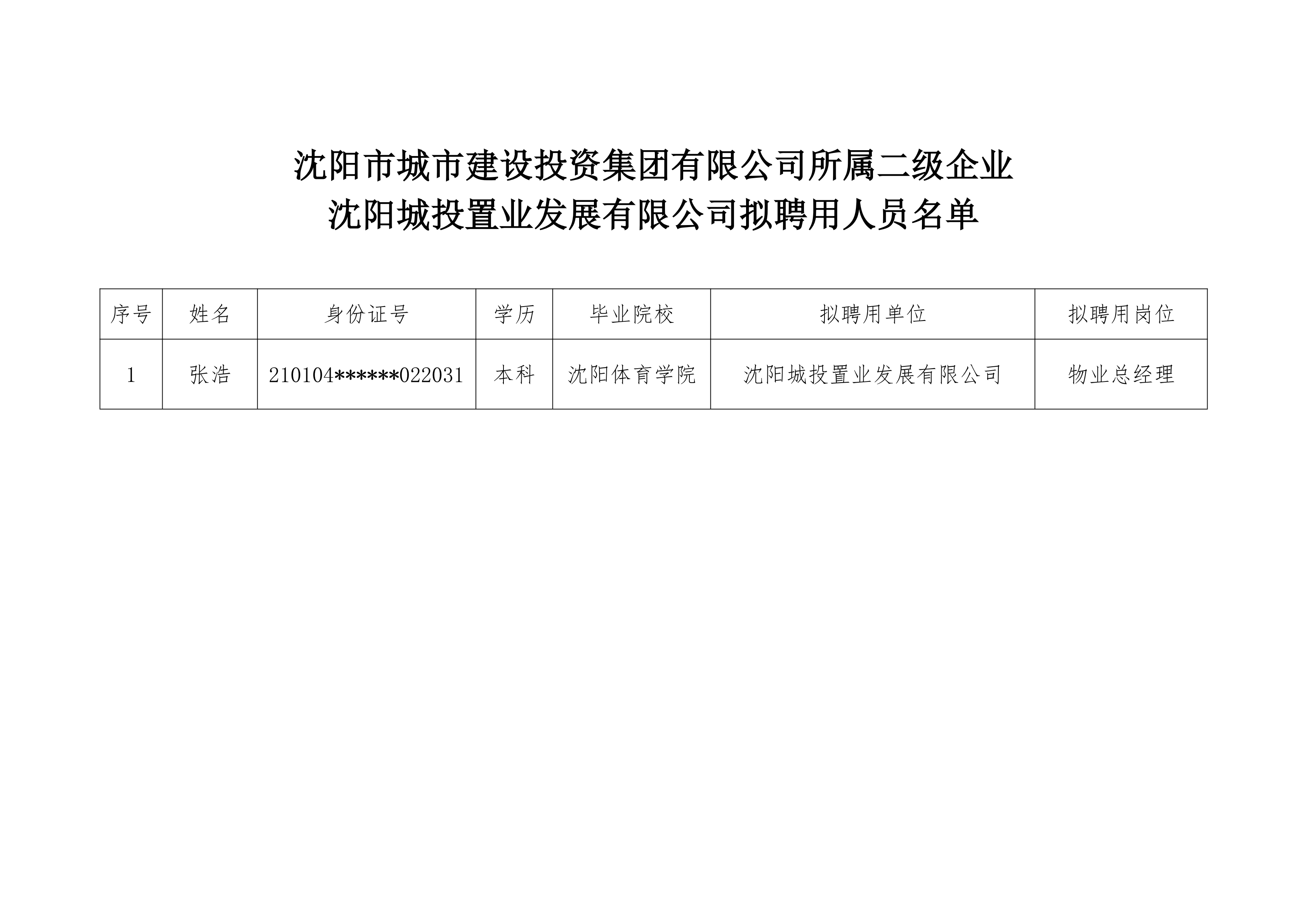 沈阳市城市建设投资集团有限公司所属二级企业沈阳城投置业发展有限公司拟聘用人员公示