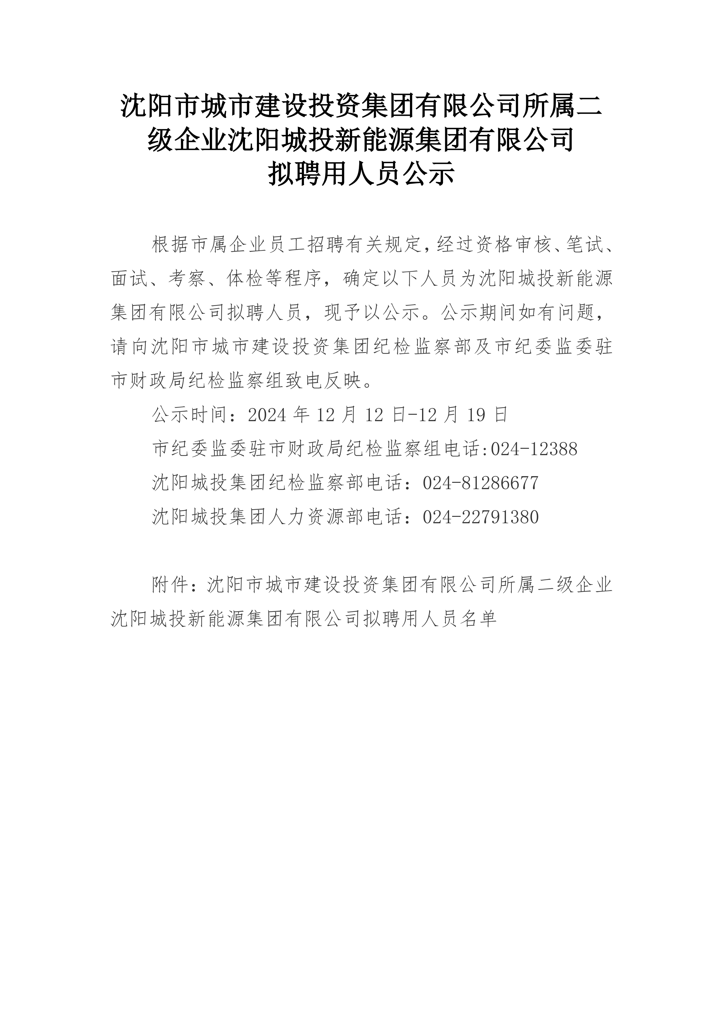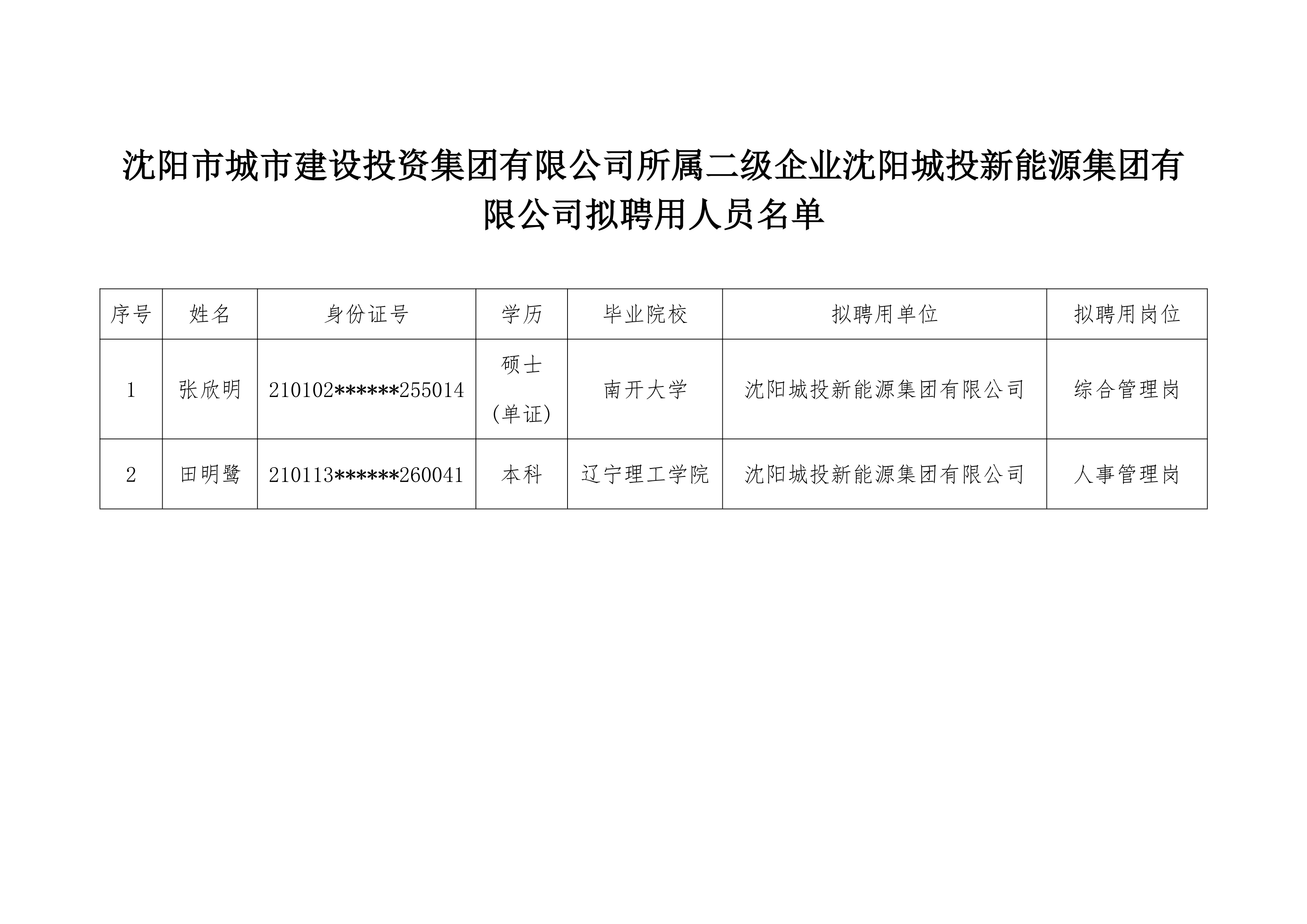 沈阳市城市建设投资集团有限公司所属二级企业沈阳城投新能源集团有限公司拟聘用人员公示