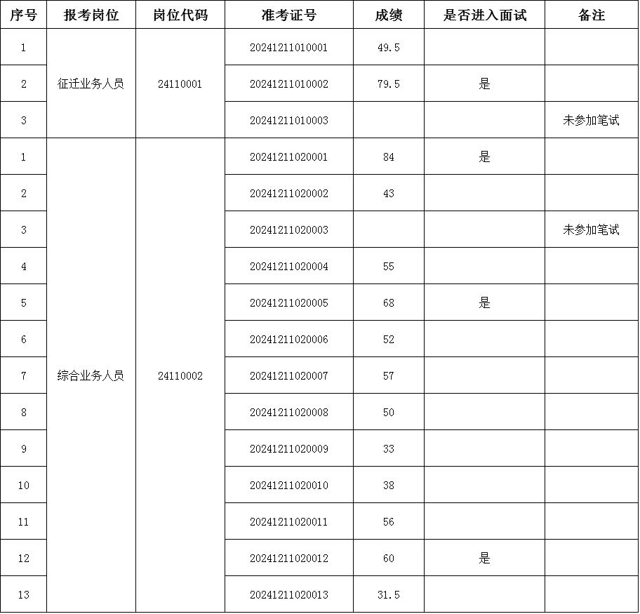 厦门垣湖房屋征迁服务有限公司2024年(11月)招聘笔试成绩单