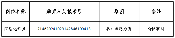 安徽白帝集团有限公司2024年下半年信息化专员岗位招聘体检考察公告已于2024年12月9日公布,入围考生确认自愿放弃体检考察,现该岗位缺额。经公司2024年第38次党委会研究决定,取消该岗位招聘。