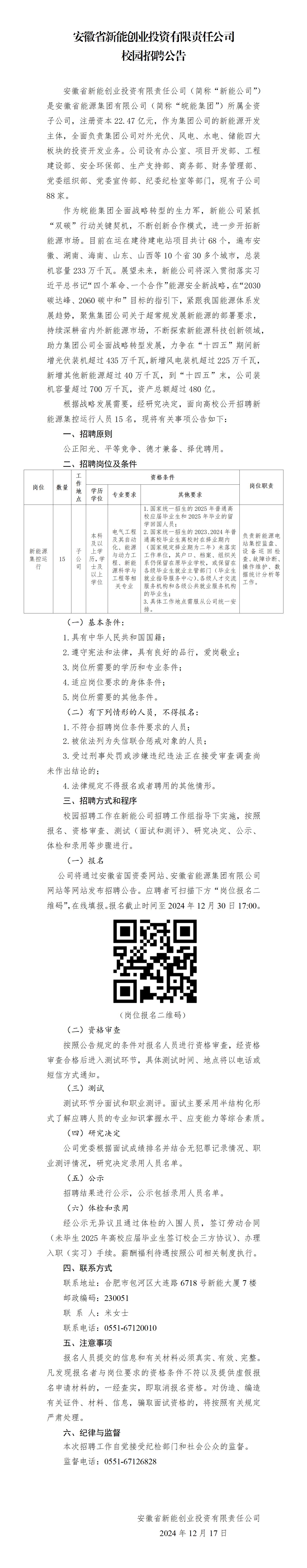 已结束 【合同制】安徽省新能创业投资有限责任公司校园招聘公告(招若干人,12月18日~01月02日报名)