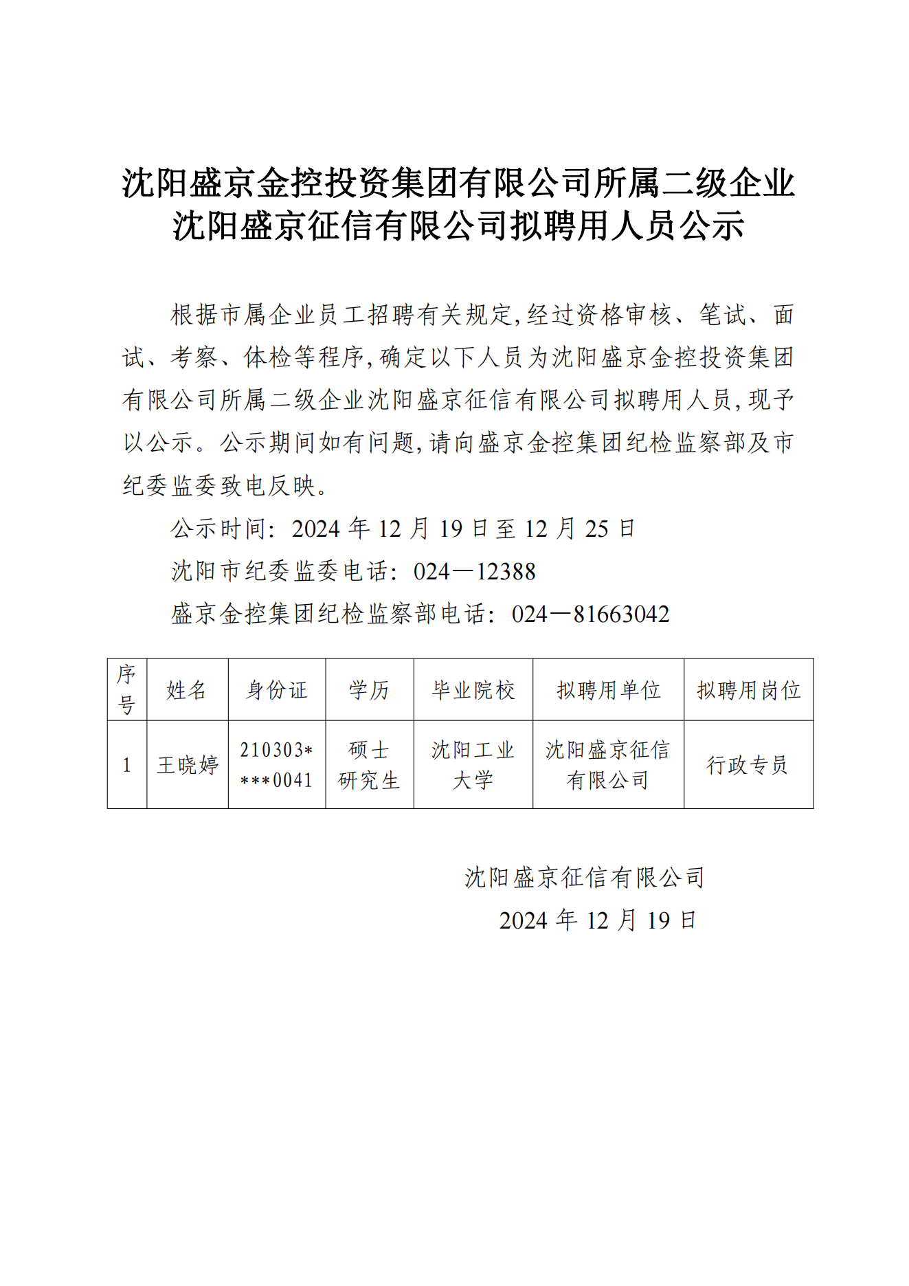 沈阳盛京金控投资集团有限公司所属二级企业沈阳盛京征信有限公司拟聘用人员公示