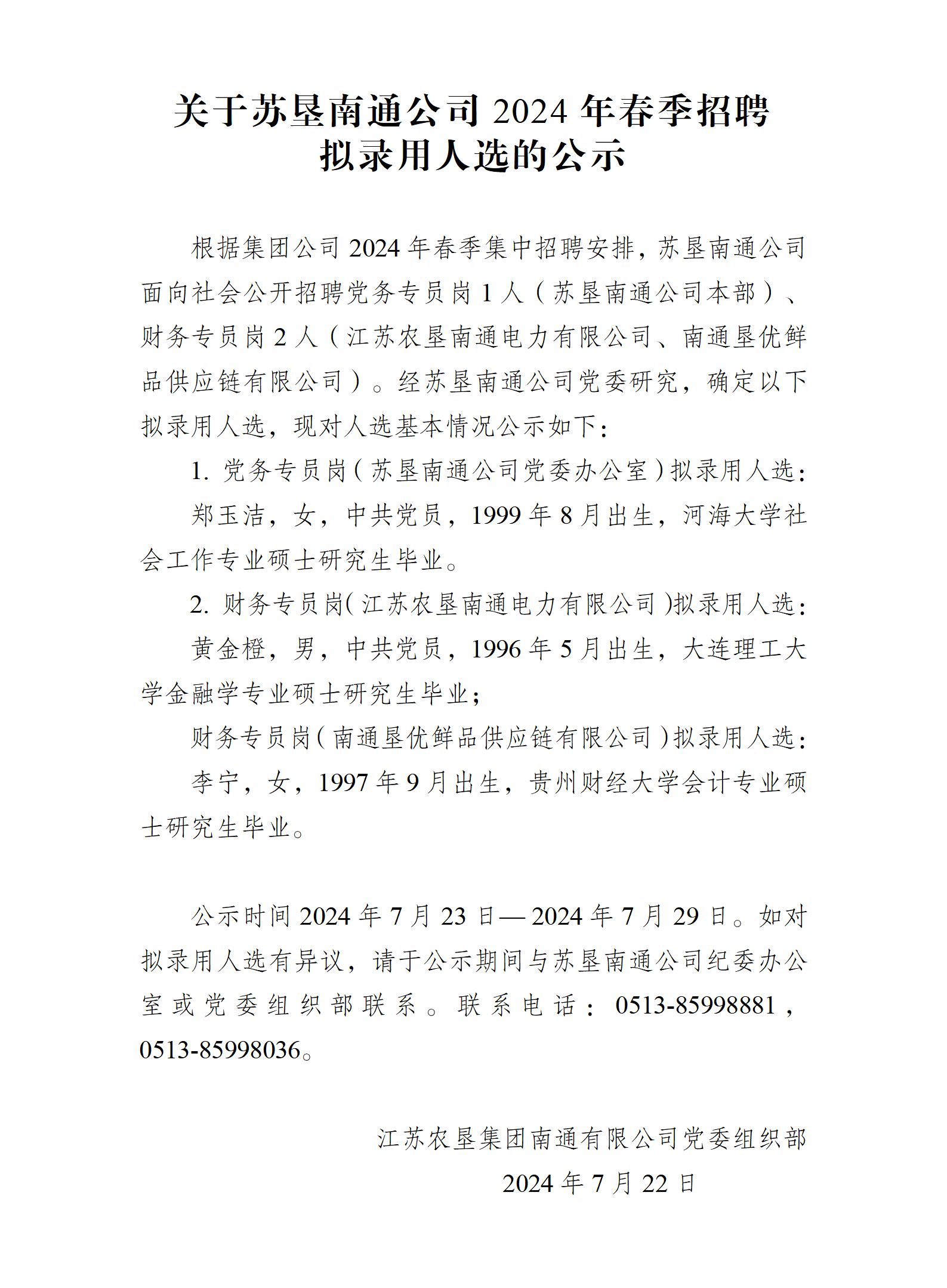 关于苏垦南通公司2024年春季招聘拟录用人员的公示