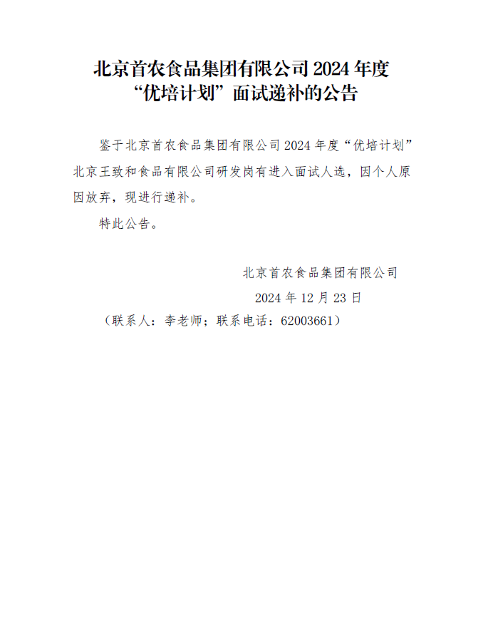 北京首农食品集团有限公司2024年度“优培计划”面试递补的公告