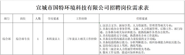 宣城市国特环境科技有限公司因发展需要,面向社会公开招聘工作人员,现将有关事项公告如下: