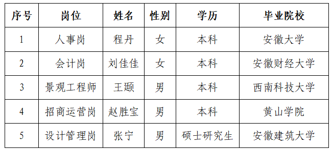 根据《安徽矾山文旅投资运营有限公司2024年下半年度社会招聘公告》的规定,经线上测评、笔试、面试、体检背调等程序,现将拟录用人员名单进行公示,公示时间:2024年12月24日至2024年12月30日,共5个工作日。