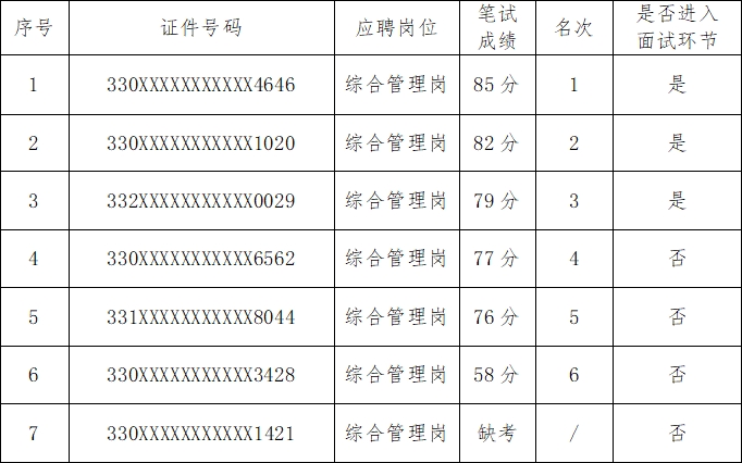 宁波市北仑区大桥管理服务有限公司公开招聘综合管理岗人员笔试工作已结束。现将笔试成绩予以公布: