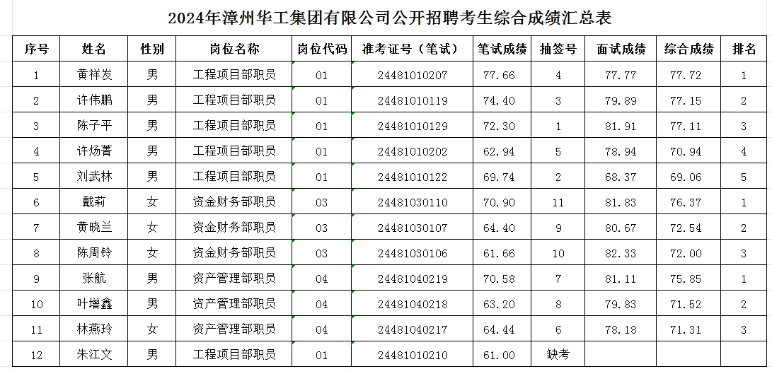 根据《2024年漳州华工集团有限公司公开招聘方案》有关要求,经过笔试及面试工作,现按程序将考生综合成绩以公示(详见附件)。