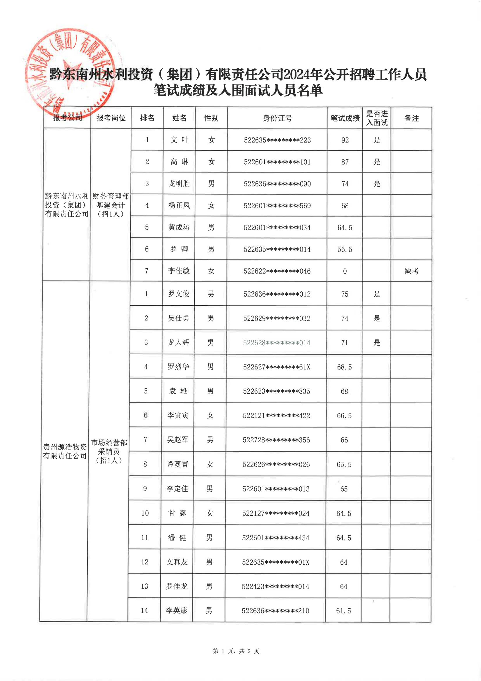 附件:黔东南州水利投资(集团)有限责任公司2024年公开招聘工作人员笔试成绩及入围面试人员名单