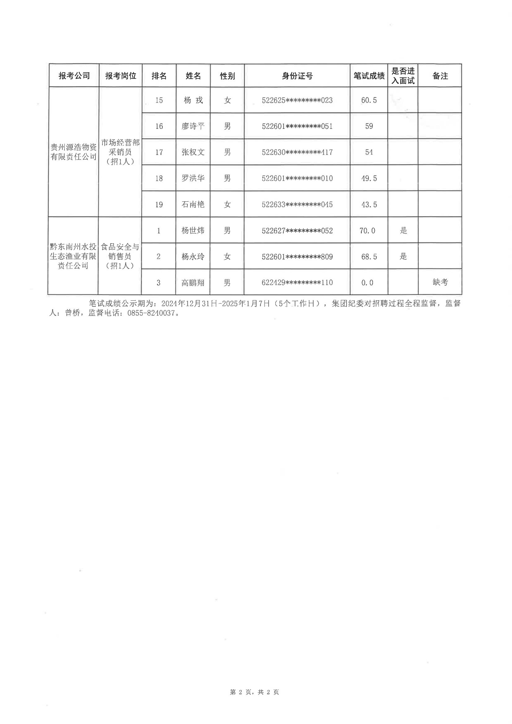 黔东南州水利投资(集团)有限责任公司2024年公开招聘工作人员笔试工作已于2024年12月30日结束,现将笔试成绩及入围面试人员名单公示如下: