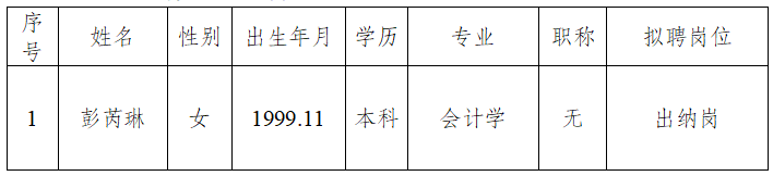 根据《泸州市国有资产监督管理委员会关于市属国有企业委托人才服务中心发布公告的通知》(泸国资委发〔2021〕111号)和2024年10月24日在川南人才网发布的《醉清风酒业股份有限公司2024年第三次社会招聘公告》,我公司严格按照招聘程序开展招聘,拟以合同制聘用彭芮琳同志,现面向社会予以公示。