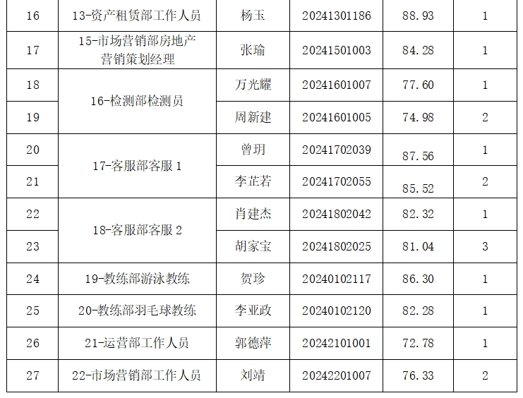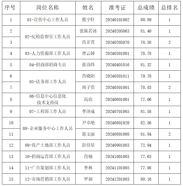 根据《吉安市城市建设投资开发有限公司及下属子公司2024年公开招聘公告》(以下简称:招聘公告)及相应公告要求,经公告发布、报名、资格初审、笔试、线下资格审查、面试、实操考试、体检、考察等工作。经研究决定,现将拟录用人员名单公示如下: