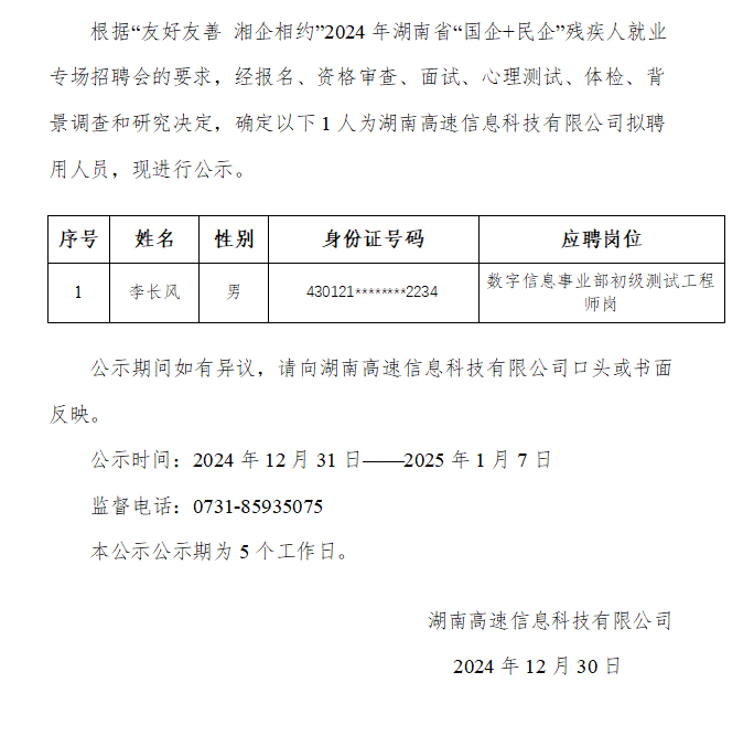 “友好友善湘企相约”2024年湖南省“国企+民企”残疾人就业专场招聘会拟录用人员公示