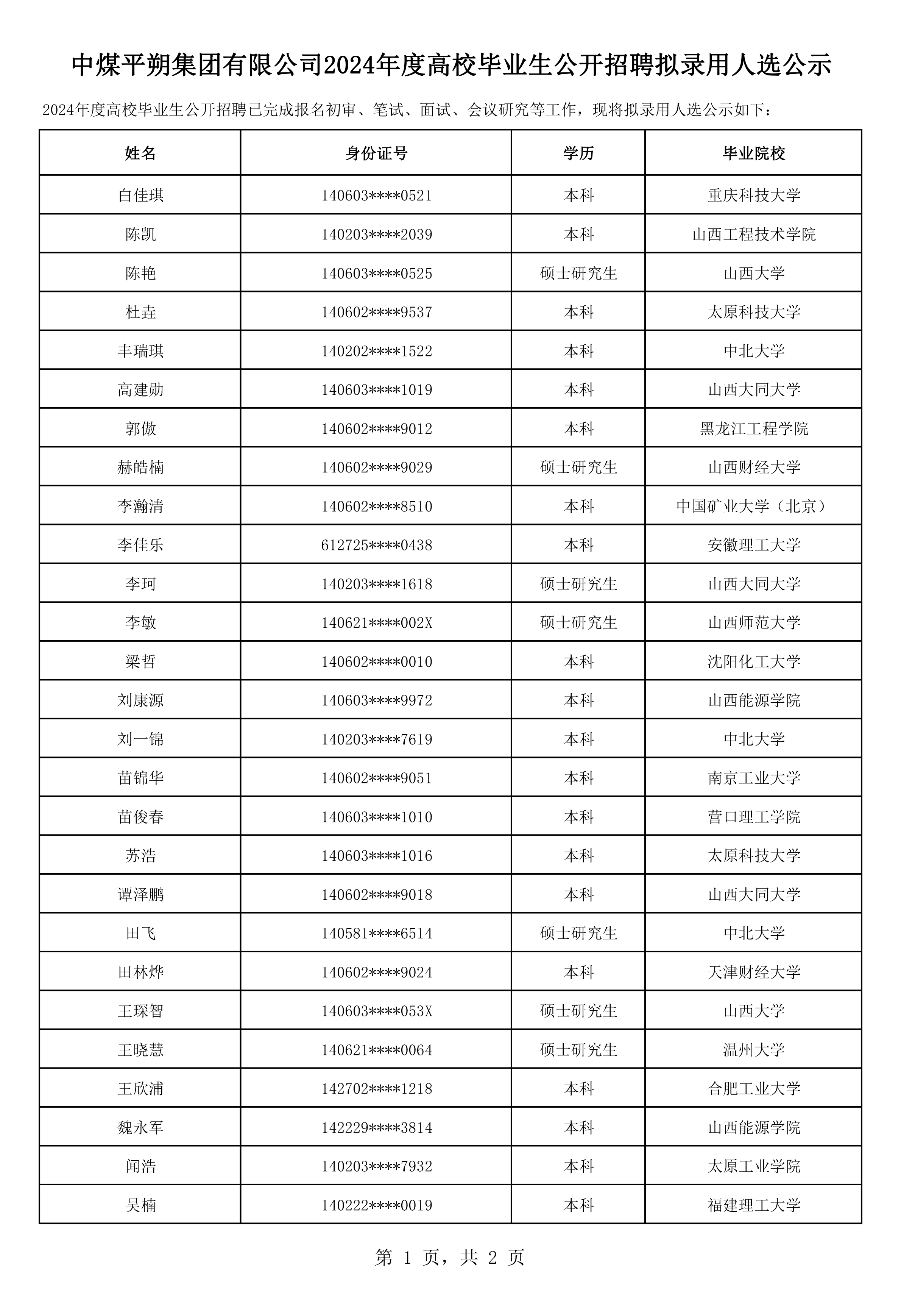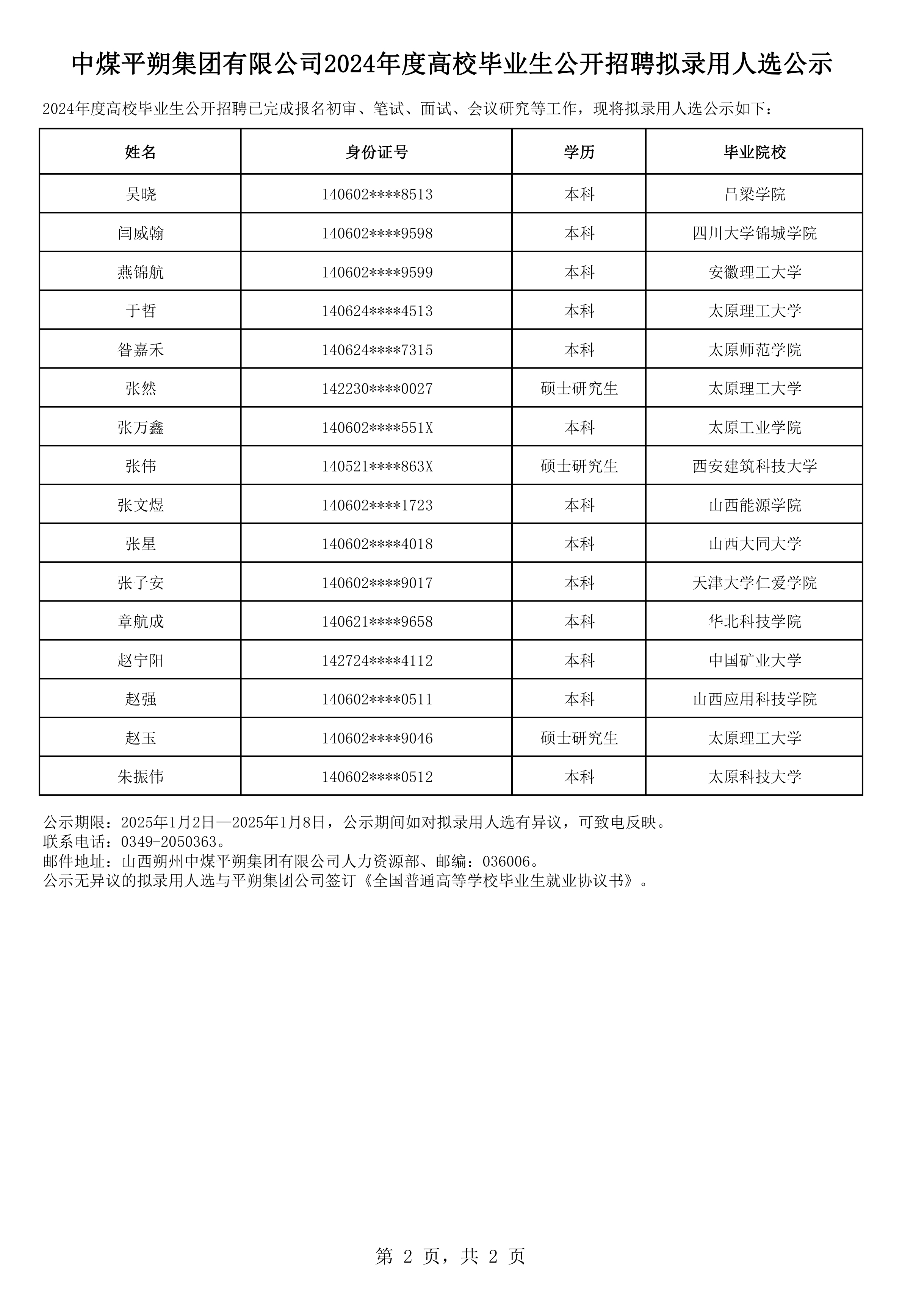 中煤平朔集团有限公司2024年度高校毕业生公开招聘拟录用人选公示