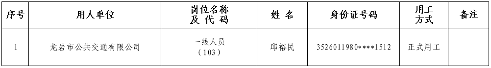 根据2024年8月29日发布的《龙岩交通发展集团有限公司所属企业关于公开遴选工作人员的公告》有关要求,经报名、资格审查、组织考试、体检、考察等程序,现将龙岩市公共交通有限公司一线人员(岗位代码103)岗位拟录用人员名单公示如下: