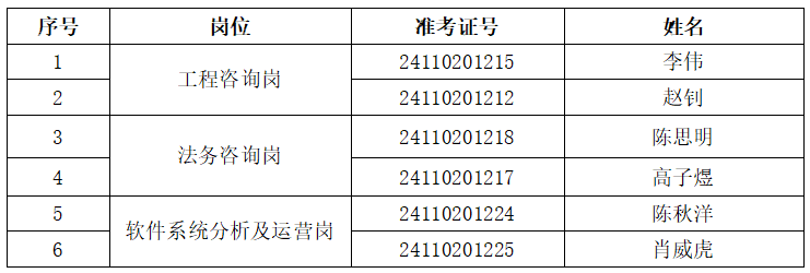 根据《安徽公共资源交易集团2024年社会招聘公告》规定,经网上报名、资格审查、笔试、资格复审、面试及体检和政审等程序,现将录用人员公示如下: