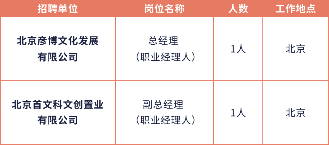 具体岗位职责及任职资格详见附件2《首都文化科技集团有限公司人才公开招聘岗位职责及任职资格》。