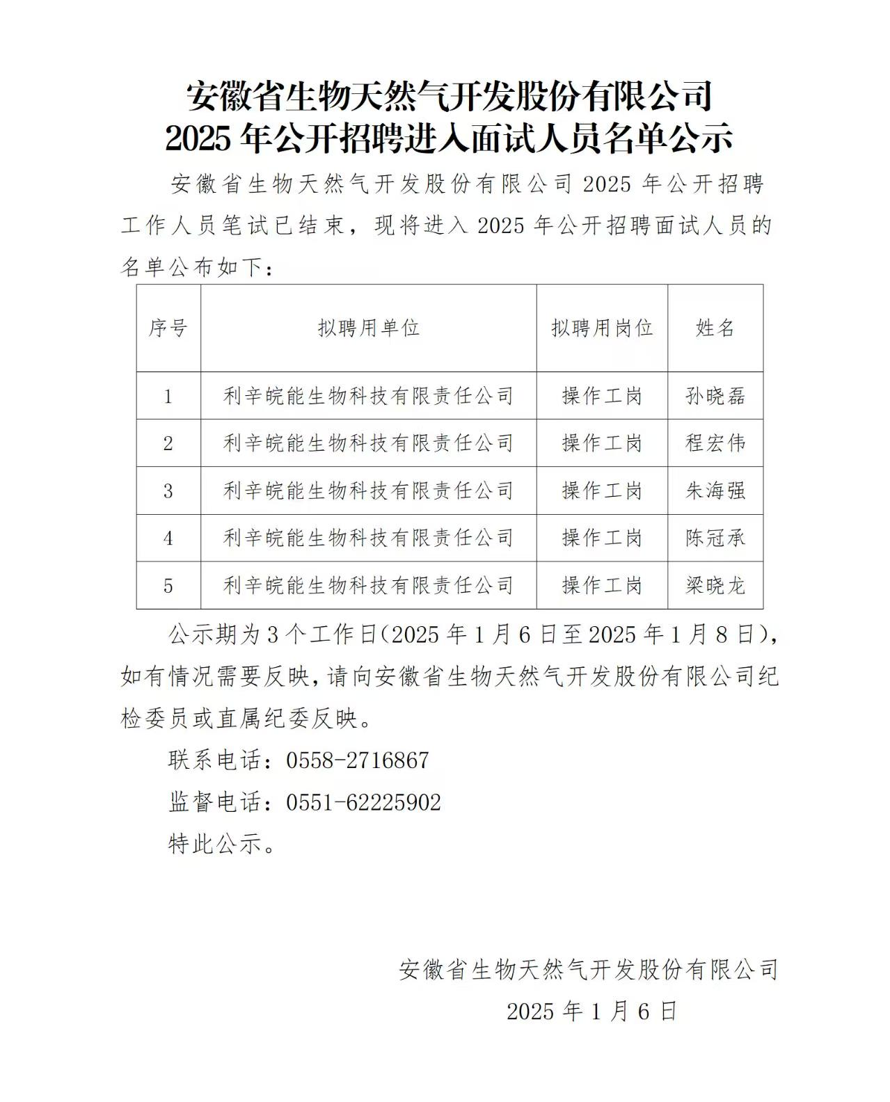 安徽省生物天然气开发股份有限公司2025年公开招聘进入面试人员名单公示