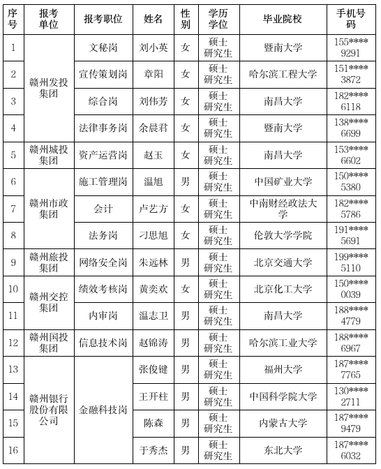赣州市属国企2024年组团引才(东北站)拟录用人员名单公示