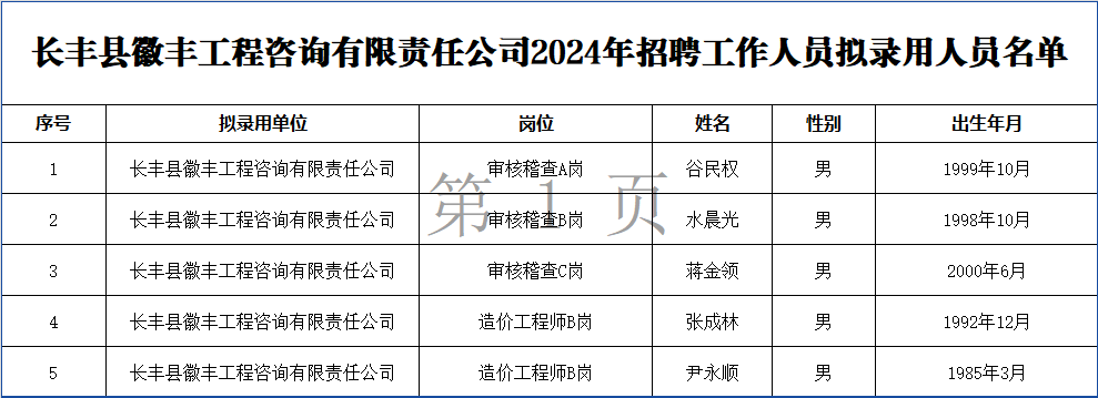 附:长丰县徽丰工程咨询有限责任公司2024年招聘工作人员拟录用人员名单