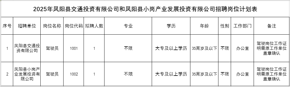 附件1:凤阳县交通投资有限公司和凤阳县小岗产业发展投资有限公司招聘岗位计划表.xlsx(见文中截图)