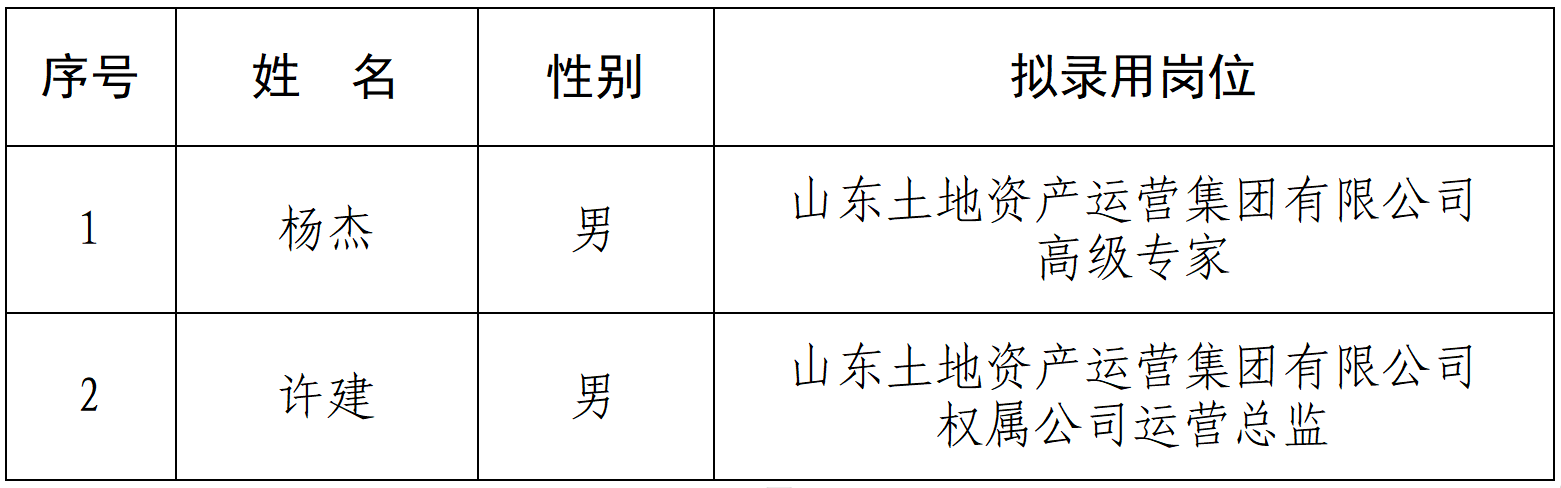 现将山东土地资产运营集团有限公司专业岗位社会招聘拟录用人员进行公示(名单附后)。公示期5个工作日,自2025年1月13日至1月17日。公示期间对拟录用人员如有异议,请向山东土地资产运营集团有限公司党群工作部(人力资源)部反映。