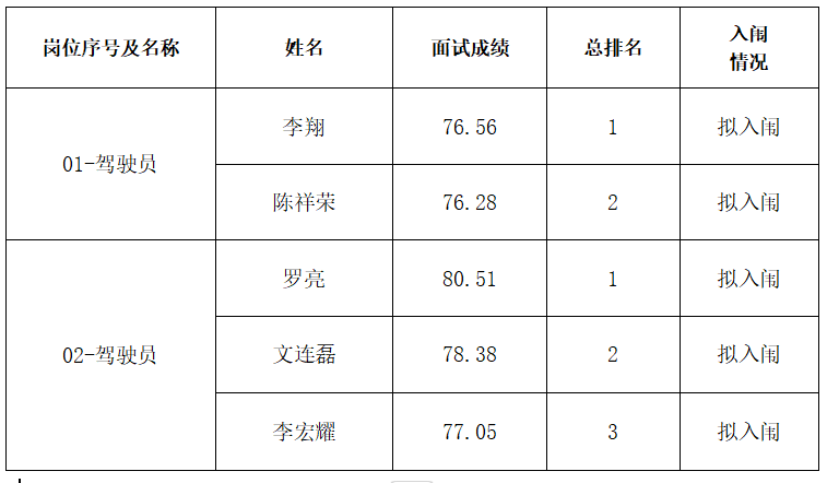根据《吉安市公务用车管理平台公开招聘驾驶员公告》要求,吉安市人才发展集团有限公司已按《公告》要求的相关程序完成了报名、资格审查、考试等工作,按《公告》要求计算总成绩后从高分到低分的顺序依次录取原则,根据计划数等额确定拟入闱体检及考察人员,现将名单公示如下: