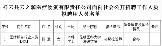 根据《祥云县云之源医疗物资有限责任公司面向社会公开招聘工作人员》公告的相关要求,公司委托第三方云南高创人才服务有限公司已完成发布招聘公告、报名及资格审查、组织考试、考察(背景调查)及体检等程序,确定以下录用人员,现予以公示。