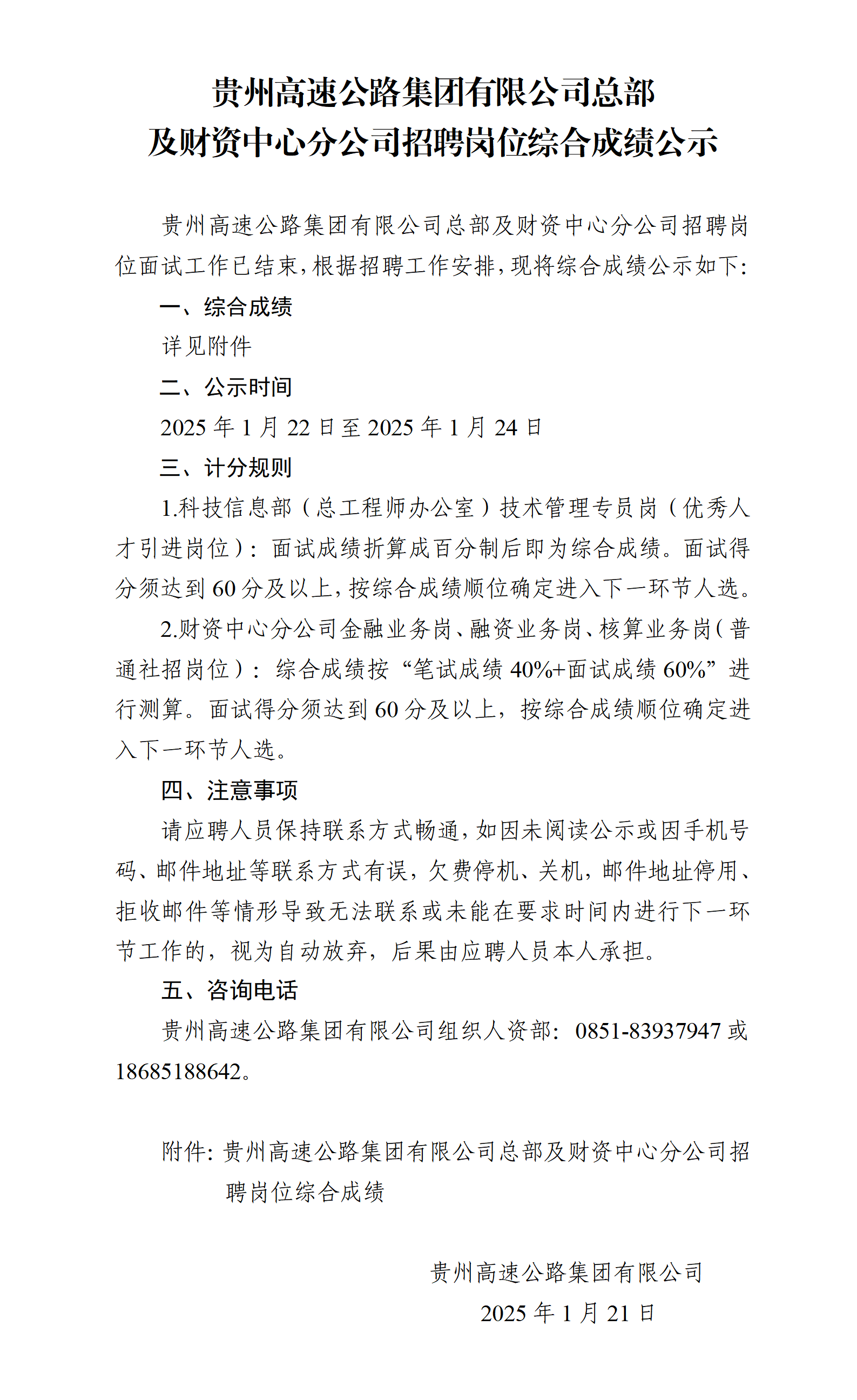 贵州高速公路集团有限公司总部及财资中心分公司招聘岗位综合成绩公示