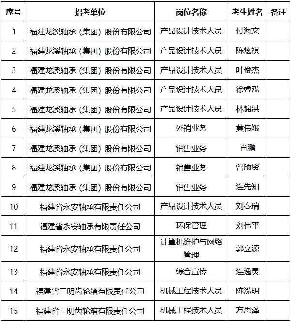 根据《福建龙溪轴承(集团)股份有限公司2024年公开招聘公告》有关规定,经笔试、面试等程序,现将集团本部及权属企业(福建省永安轴承有限责任公司、福建省三明齿轮箱有限责任公司)拟聘用人员予以公示,公示期为5个工作日,公示名单如下:
