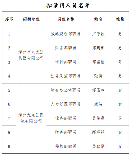 根据《漳州市九龙江集团有限公司2024年公开招聘公告》规定,经笔试、资格复审、面试、体检与政审等程序,现将拟录用人员予以公示,公示时间从2025年1月24日开始,公示期为五个工作日。公示期间欢迎群众来电、来信、来访反映情况。