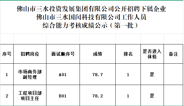 三水发展集团公开招聘下属企业国闰公司工作人员综合能力考核成绩公示(第一批)