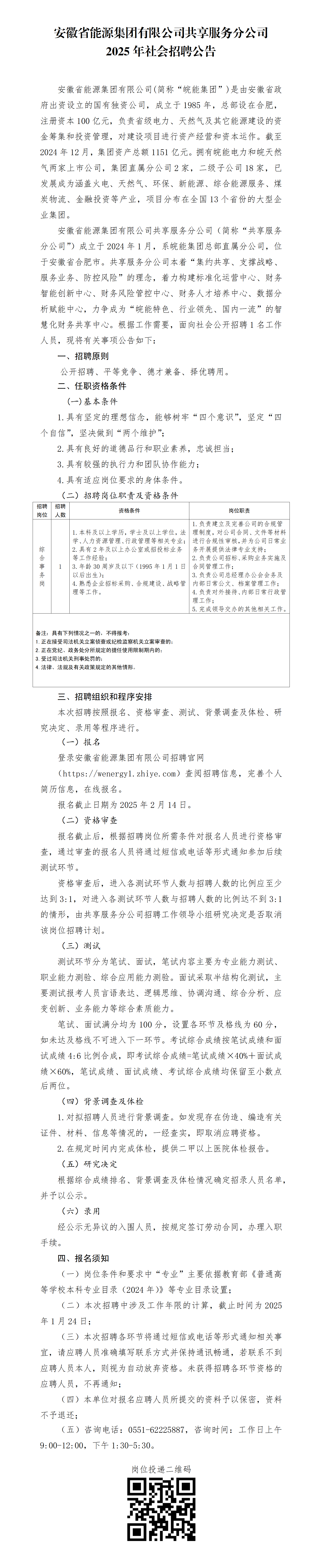 已结束 【合同制】安徽省能源集团有限公司共享服务分公司2025年社会招聘公告(招若干人,01月24日~02月08日报名)