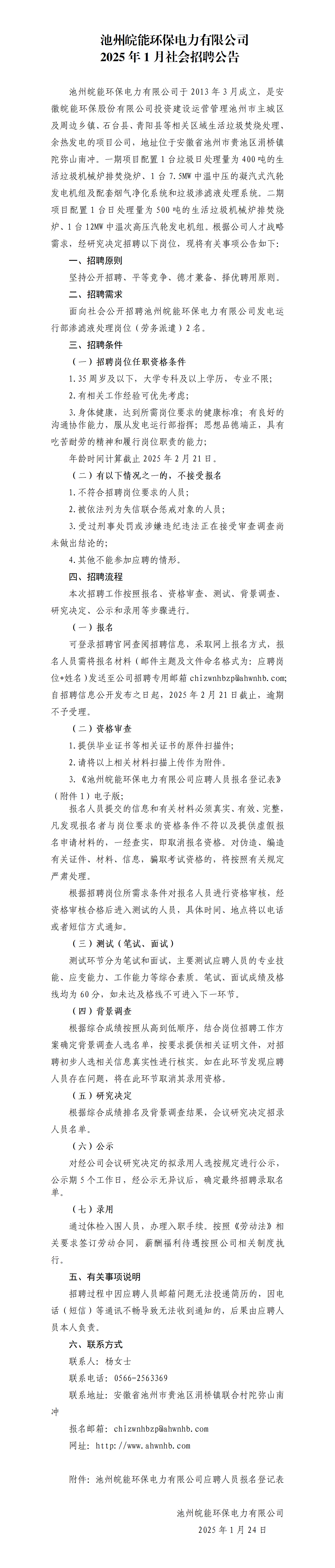 已结束 【合同制】池州皖能环保电力有限公司2025年1月社会招聘公告(招若干人,01月24日~02月08日报名)