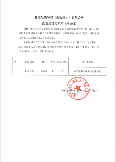 淼控生物环保(佛山三水)有限公司副总经理拟录用名单公示