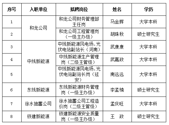 根据《中国南水北调集团新能源投资有限公司中层及职员社会招聘公告》,现将我公司第二批8个岗位拟聘人员予以公示。