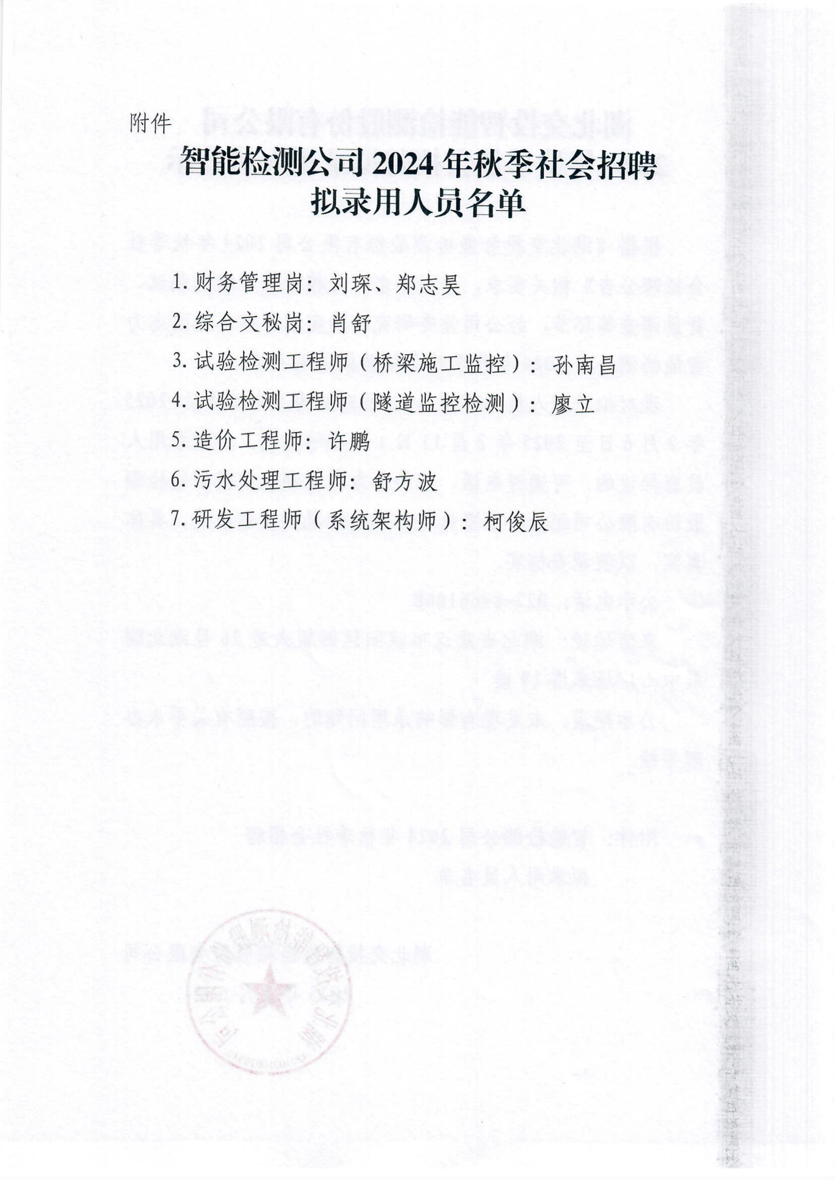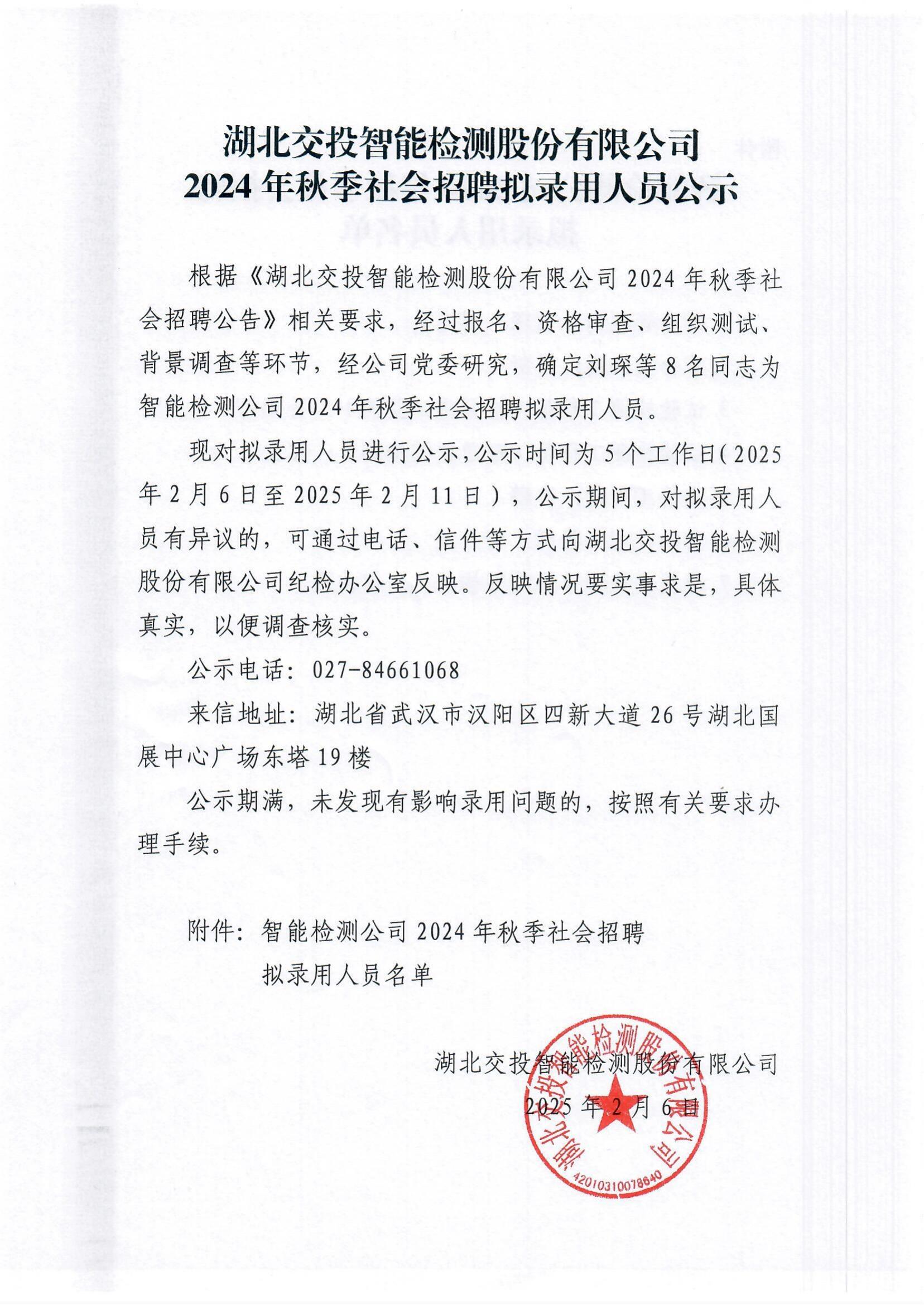 湖北交投智能检测股份有限公司2024年秋季社会招聘拟录用人员公示
